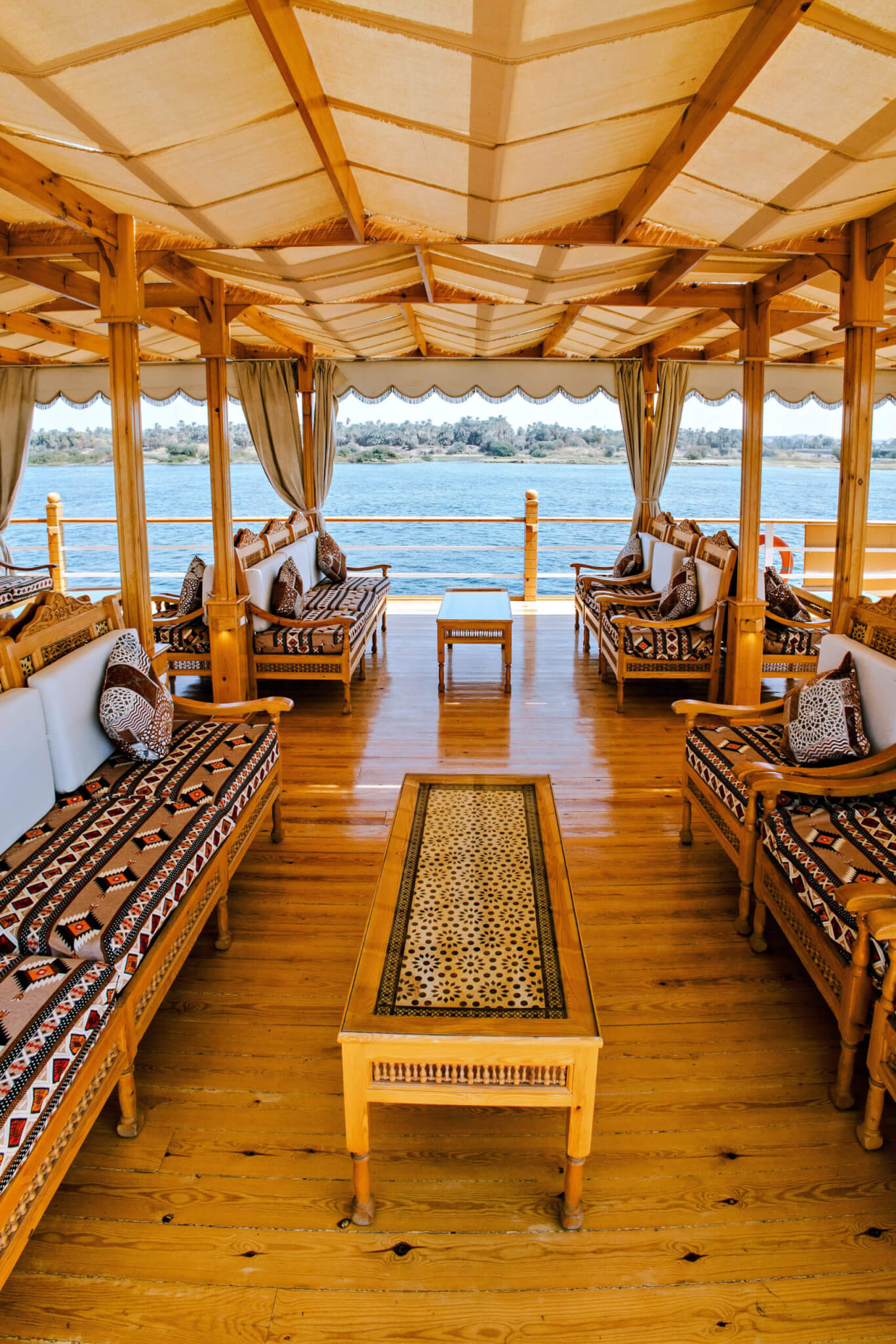 Tout est fait pour profiter d’une navigation paisible et s’adonner à la contemplation du Nil et de ses berges. Le salon-bar dispose de fauteuils confortables, d’un écran plat, d’un coin bibliothèque et de larges fenêtres ouvrant sur le fleuve. Un accès Internet est disponible gratuitement sur le navire. Le restaurant propose une cuisine égyptienne traditionnelle, variée et exigeante, élaborée avec soin. Les repas sont servis sous forme de buffet. L’eau minérale, le thé ou café et un verre de vin sont inclus durant les repas. Pour vous détendre ou vous rafraîchir, le pont Soleil dispose de chaises longues et d’une petite piscine, d’un salon oriental et de tables où vous seront servis un thé et des mignardises pour admirer agréablement le coucher du soleil sur les temples antiques.